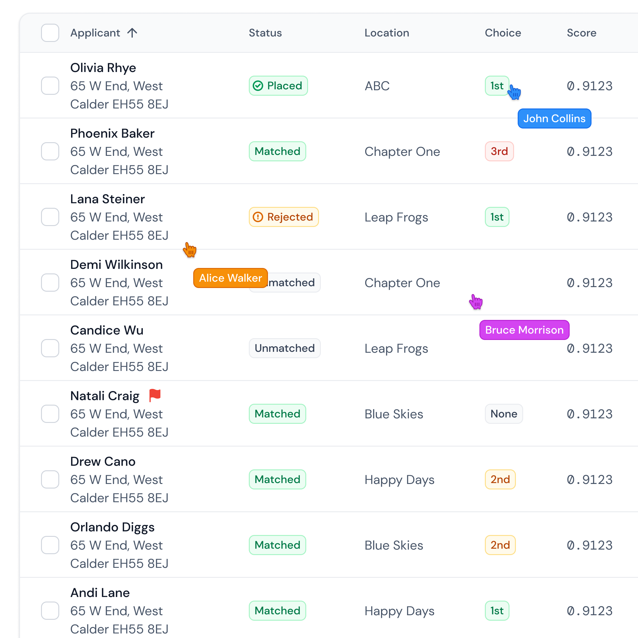 All applications are scored by the same algorithm, which is defined by your decision-making matrix. Take distance, siblings, ages etc into account.
